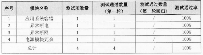 可靠性方面:測試范圍包括應用系統容錯、異常斷電、異常斷網、電源模塊冗余共4個模塊,執行四條用例,全部通過。